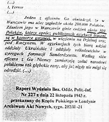 Raport Wydz. Bezpieczeństwa AK, Nr 227, 22.11.1943 r. Archiwum akt nowych, Sygn. 202\11-21) w Warszawie ma ulec zagładzie ok. 200 tys. Polaków (…) w Warszawie ginie codzień ok. 300 Polaków, którzy oprócz publicznych egzekucji traceni są w komorze gazowej, w więzieniu na Dzielnej oraz pod Raszynem. (…) Niemcy zamierzają zadać Narodowi Polskiemu tak glębokie rany, aby już nigdy nie mógł się odrodzić (…)
