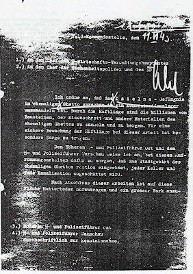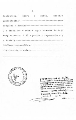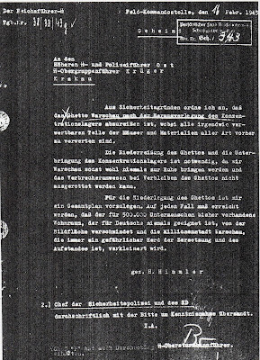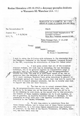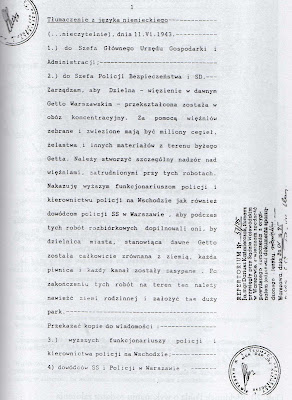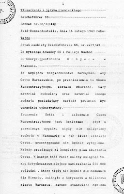 7.3 Tłumaczenie rozkazu Himlera z dn. 16. 02. 1943 r. Cytat: „Ze względów bezpieczeństwa zarządzam, aby Getto Warszawskie, po przeniesieniu tu Obozu Koncentracyjnego, zostało zbużone. (…) W każdym bądź razie należy osiągnąć to, aby dotychczasowe miejsce zamieszkania 500 tysiecy podludzi, które nigdy nie będzie się nadawało dla Niemców, zniknęło z horyzontu a milionowe miasto Warszawa, zawsze stanowiące ognisko destrukcji, oporu i buntu, zostało pomniejszone.”