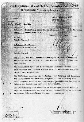 7.6 Meldunek Pohla o wykonaniu rozkazu założenia KL Warschau w byłym getcie. Fragment z tłumaczenia cyt.: (…)Melduję, że na terenie Getta warszawskiego został wzniesiony Obóz Koncentracyjny i pierwsi więźniowie zostali wprowadzeni dnia 19. 7. 43. (…)