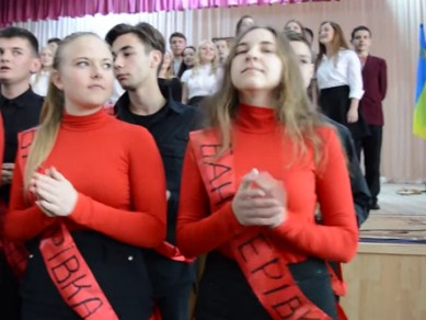 Licealiści zaśpiewali piosenkę „My, Banderowcy!”. Słowa „Ja, banderowiec” (lub „banderówka”) wypisano na przerzuconych przez ramiona uczniów wstęgach.