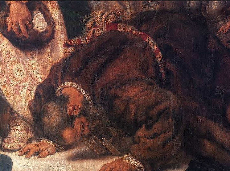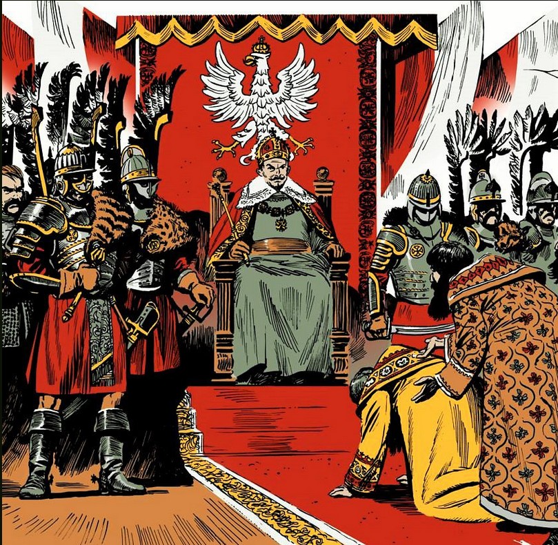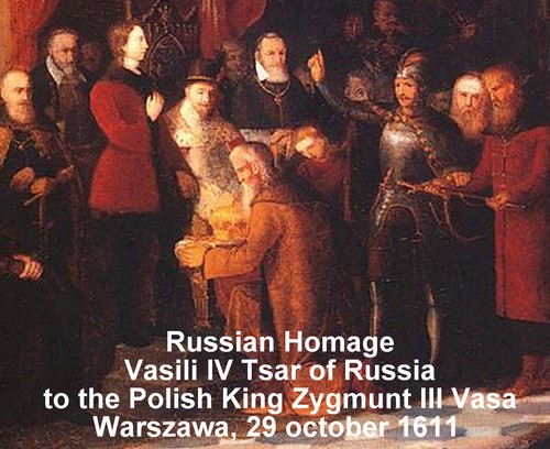 Then there was a climax – the Russian Homage expected by everybody. The tsar of Russian bent low to the very ground, so that he touched the floor with his right hand and kissed the middle of his hand. Then Wasyl IV swore an oath and humbled himself towards the majesty of the Polish Republic, he admitted that he had been defeated and promised that Russia would never invade Poland any more. Then after that ceremony, the king of Poland Zygmunt III Waza held out his hand to the Russian tsar to the kiss. While the great Ukrainian prince Dymitr, the commander of a Russian army defeated by a Polish army at Kluszyn, fell onto his face and bowed humbly to the Polish king and the Republic of Poland and the swore the same oath as the tsar. The great Ukrainian prince Iwan also fell onto his face and bowed humbly three times touching the floor of the Royal Castle then swore an oath and finally he started crying in the eyes of all present people. During this whole ceremony of the homage, Russian flags, gained on Kremlin, were lying on the floor in front of the victorious hetman, the king and present dignitaries of the Polish Republic; and the most important flag was among them – the tsarist flag with an ominous black two-headed eagle.