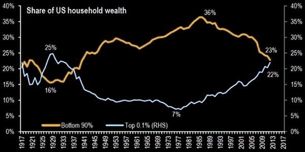 Rok 1971 był kluczowy. Od tej pory zmiany zaczęły postępować bardzo szybko. Elity nie zamierzały marnować czasu. Udział 0,1% najbogatszych w majątku społeczeństwa dotknął dna kilka lat po decyzji Nixona, a następnie zaczął rosnąć i powiększa się aż do chwili obecnej. Znakomicie ilustruje to poniższy wykres dotyczący sytuacji w Stanach Zjednoczonych. Udział wspomnianej grupy najbogatszych osób zaznaczony został na pomarańczowo, natomiast udział 90% najbiedniejszych – na niebiesko.