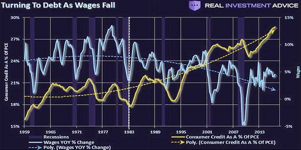 Z czasem system zaczyna pękać w szwach, a wspomniany wzrost kosztów utrzymania jest wyższy niż wzrost wynagrodzeń. Aby utrzymać standard życia, społeczeństwo zaciąga kredyty. Na potwierdzenie przypomnę wykres dotyczący sytuacji w USA. Przerywana pomarańczowa linia pokazuje wzrost udziału kredytów w ogólnych wydatkach obywateli. Z kolei niebieska linia pokazuje spadającą dynamikę wzrostu wynagrodzeń.