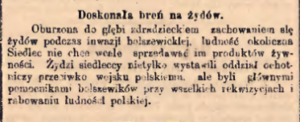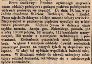 Z treści komunikatów Sztabu Generalnego Wojska Polskiego z dnia 21 sierpnia czytelnicy dowiedzieli się, że w prasie działań frontu środkowego działał po stronie sowieckiej oddział ochotników-żydów z Włodawy13. Podając informacje o dalszych walkach zwrócono uwagę, że w czasie zdobywania Białegostoku przez 1 dywizję legionów trwały w mieście (…) zaciekłe walki uliczne, z przybyłą na pomoc z Grodna 55 dywizją sowjecką i miejscową ludnością żydowską, która wydatnie zasiliła szeregi bolszewickie14.