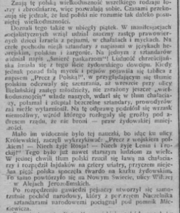 Nieufność w stosunku do społeczeństwa żydowskiego była wśród polskiej ludności spora. Ocieplenia relacji nie ułatwiały różnego rodzaju incydenty utwierdzające Polaków w niejasnych zamiarach żydowskich wobec Polski. Przykładem tego była sytuacja z 1 maja 1920 roku, kiedy to w Warszawie miała miejsce manifestacja socjalistyczna, która doprowadziła do zamieszek w stolicy. Jak relacjonowała prasa, W manifestacjach socjalistycznych wziął udział znaczny zastęp prawowiernych dzieci Izraela (…) Kiedy jednak ponad falą mycek i pejsów pojawiła się tablica z napisem „Precz z Polską!”, w przyglądającym się tłumie polskim odezwały się szemrania, aż wreszcie przy ulicy Bielańskiej zastęp młodzieży, nie zarażony jeszcze „wielkodusznością” władz naszych, wdarł się w tłum chałaciarzy, połamał i zdeptał bezczelne sztan