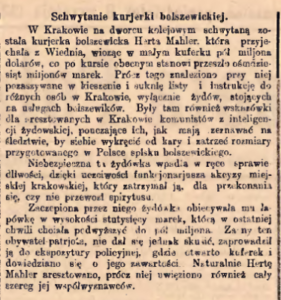Głośnym wydarzeniem stała się również sprawa, jaka miała miejsce na dworcu w Krakowie, gdzie została aresztowana kurjerka sowiecka Herta Mahler, która przewoziła z Wiednia pół miliona dolarów i listy z instrukcjami dla osób z Krakowa (…) wyłącznie żydów, stojących na usługach bolszewików. Były tam również wskazówki dla aresztowanych w Krakowie komunistów z inteligencji żydowskiej, pouczających ich, jak mają zeznawać na śledztwie, by siebie wykręcić od kary i zatrzec rozmiary przygotowanego w Polsce spisku bolszewickiego18. Podobna sytuacja miała miejsce w Łodzi, o czym informowała „Gazeta Świąteczna” w numerze z 22 sierpnia. Aresztowano tam dwie działaczki bolszewickie Esterę Koplewiczównę i Ryfkę Rawską za rozrzucanie wśród robotników na ulicy odezw wzywających do tworzenia rad robotniczych bolszewickich i nie wstępowanie do polskiego wojska ochotniczego. Trzecią działaczkę komunistyczną Perlę Ajzenbaumównę zatrzymano w Rudzie Pabianickiej. Siała ona propagandę wśród ludności, że nie należy bić się za Polskę19. Rada Gminna w Złoczewie (powiat sieradzki) uchwaliła tekst wysłany do rządu w sprawie działalności żydowskiej mającej polegać na fakcie, że (…) pod pozorem handlu żydzi chodzą po wsiach i podżegają ciemnych ludzi, żeby nie dawali pieniędzy na pożyczkę państwową, ani ochotnika do wojska polskiego i nie udzielali naszemu wojsku pomocy20. „Kurjer Warszawski” informował, że na ulicy Nowy Świat w Warszawie żandarmeria aresztowała małżeństwo Kowarskich, którzy otrzymali mieszkanie po swoim krewnym żydzie Kowarskim, który po wybuchu wojny wyjechał do Rosji. Zdaniem Gazety małżeństwo (…) zdradzało wobec lokatorów domu, zwłaszcza zaś w pośród służby wielką sympatje dla bolszewików21.