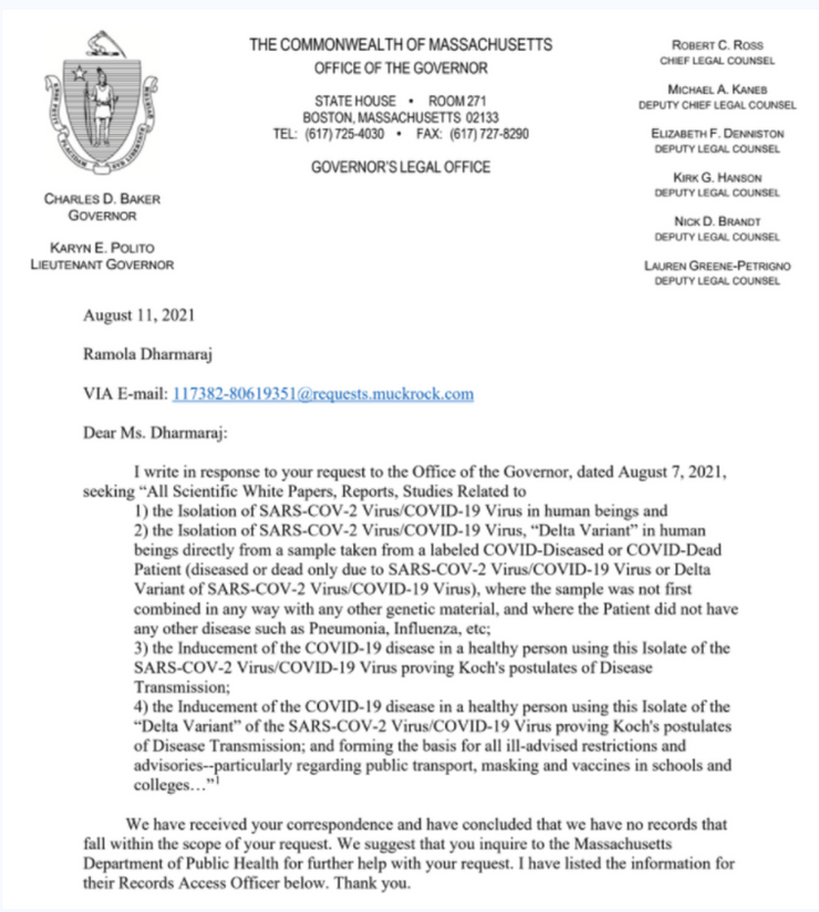 The letter states “The Department has no responsive records to your request,” the Massachusetts Department of Public Health responded to a FOIA request under Massachusetts Public Records Law made on August 7, 2021 by this reporter requesting information on all scientific white papers and studies related to the isolation of the “SARS-COV-2 Virus/COVID-19 Virus” and the “Delta Variant” in human beings, essentially admitting it has no information on the much-propagandized virus on the basis of which the Commonwealth of Massachusetts has held the state hostage since last spring, issuing a number of COVID restrictions and absurd mandates and guidances which curtail the Constitutionally-protected freedoms and rights of all Americans living in Massachusetts-and which still do so, especially targeting public-transportation users, retail-workers, healthcare-workers, college students, and schoolchildren.