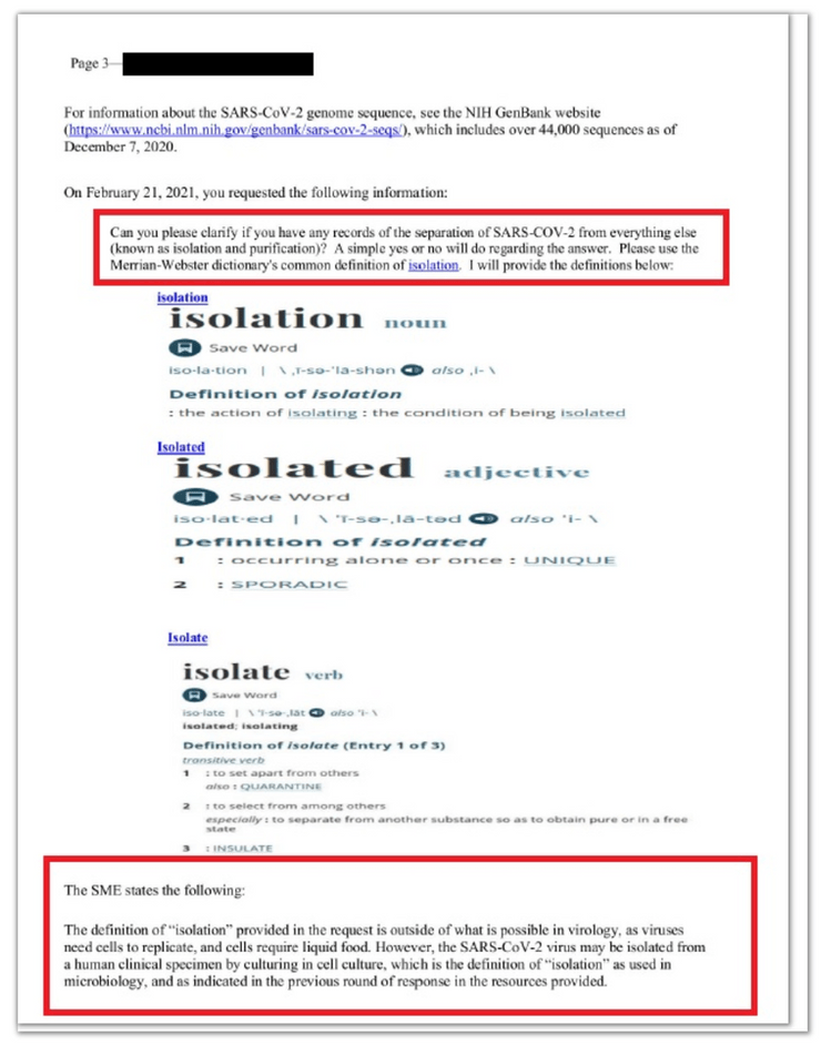 Previously also, the CDC had been queried by Christine Massey and returned a response on June 7, 2021 stating there was no information on a purified isolate of the professed SARS-COV-2/COVID-19 virus.