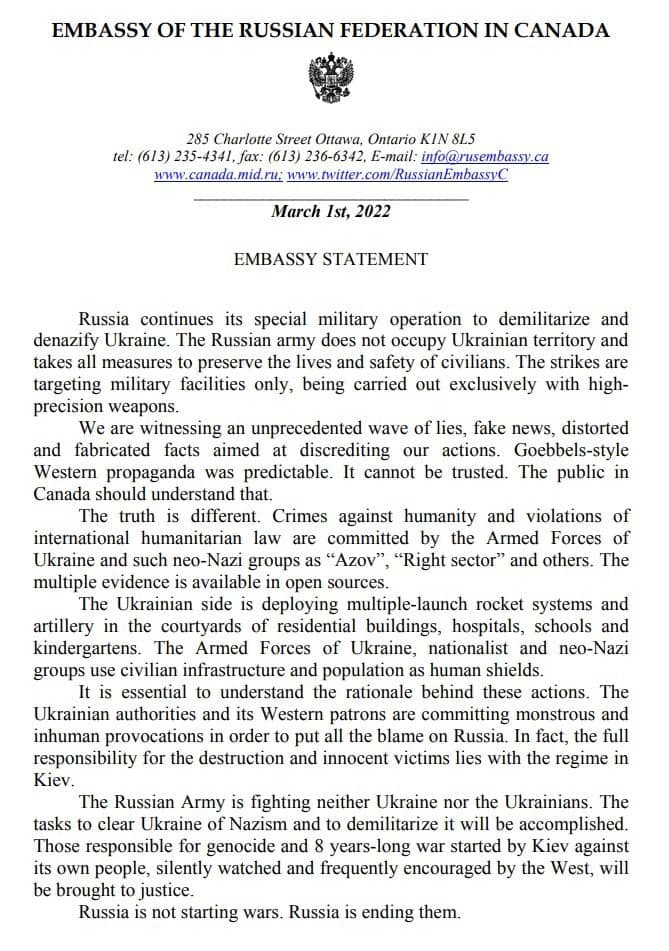 “The Russian side expects that Canada and other Western partners of Ukraine will no longer turn a blind eye to the numerous crimes perpetrated by the Kiev regime, which is waging a war against its own people that has resulted in thousands of civilian victims. The only way forward towards a peaceful resolution to the conflict is to bring Kiev back to the negotiating table with the representatives of Donetsk and Lugansk and to its unconditional compliance with the “Package of Measures for the Implementation of the Minsk Agreements,” the diplomatic mission concluded. Source; https://tass.com/world/1390167
