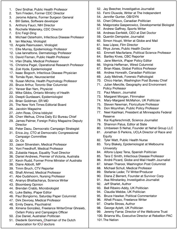 A provisional list of institutions and individuals who pushed “zero covid.”