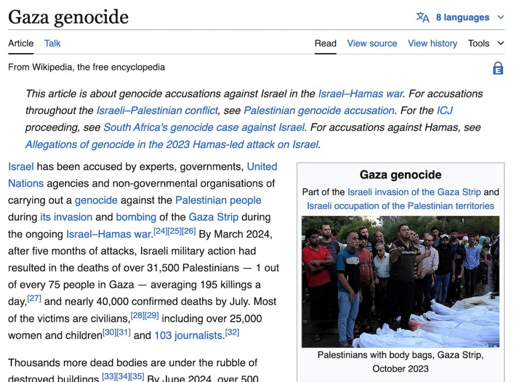 Wikipedia editors have changed its entry “Allegations of genocide in the 2023 Israeli attack on Gaza” to “Gaza genocide” as Israel continues its massacre with the full support of the U.S.