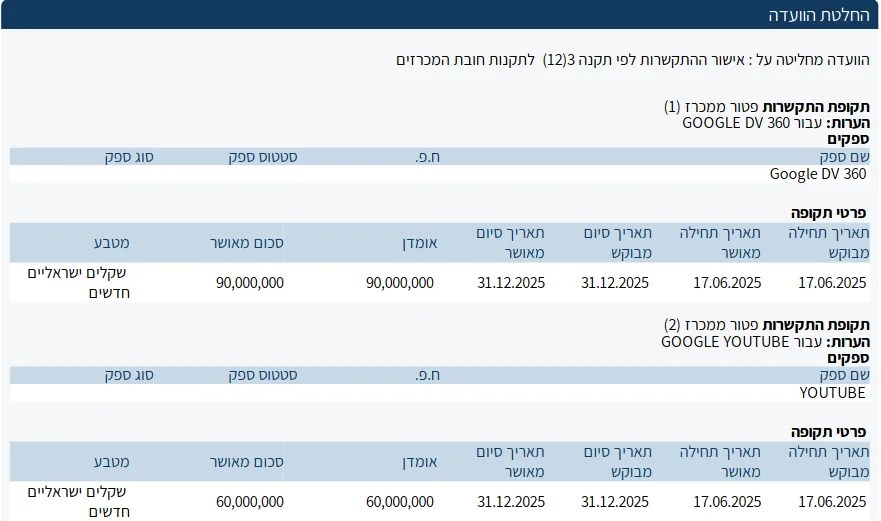 A screenshot from the Israeli government disclosure of the roughly $45 million contract between Israel’s government advertising bureau (Lapam) and Google’s Display & Video and YouTube advertising platforms. Both campaigns are listed as spanning June 17 to December 31, 2025.