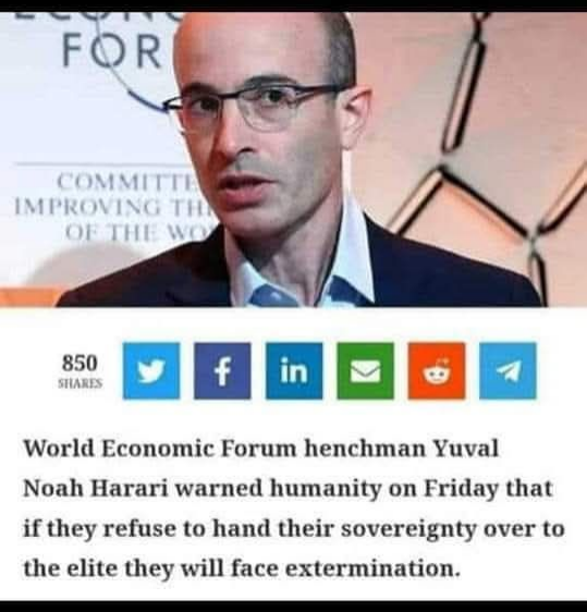 World Economic Forum psychotic Yuval Noah Harari, and climate clown Vanessa Nakate warned humanity on Friday that if they refuse to hand their sovereignty over to the elite they will face extermination.