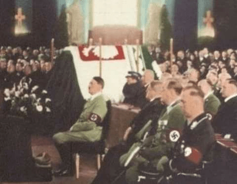 Na zdjęciu: Hitler podczas honorowych uroczystości żałobnych po śmierci Józefa Piłsudskiego, które odbyły się w Berlinie przy symbolicznej trumnie. fot. „Morze” 1935, nr 6, s. 16.
